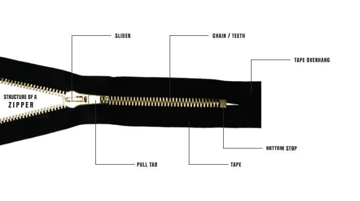 Understand the structure of the zipper with all the elements working together it is quite common for simple issues with their function which can be easily avoided or repaired with basic understanding of the structure of the entire zipper.